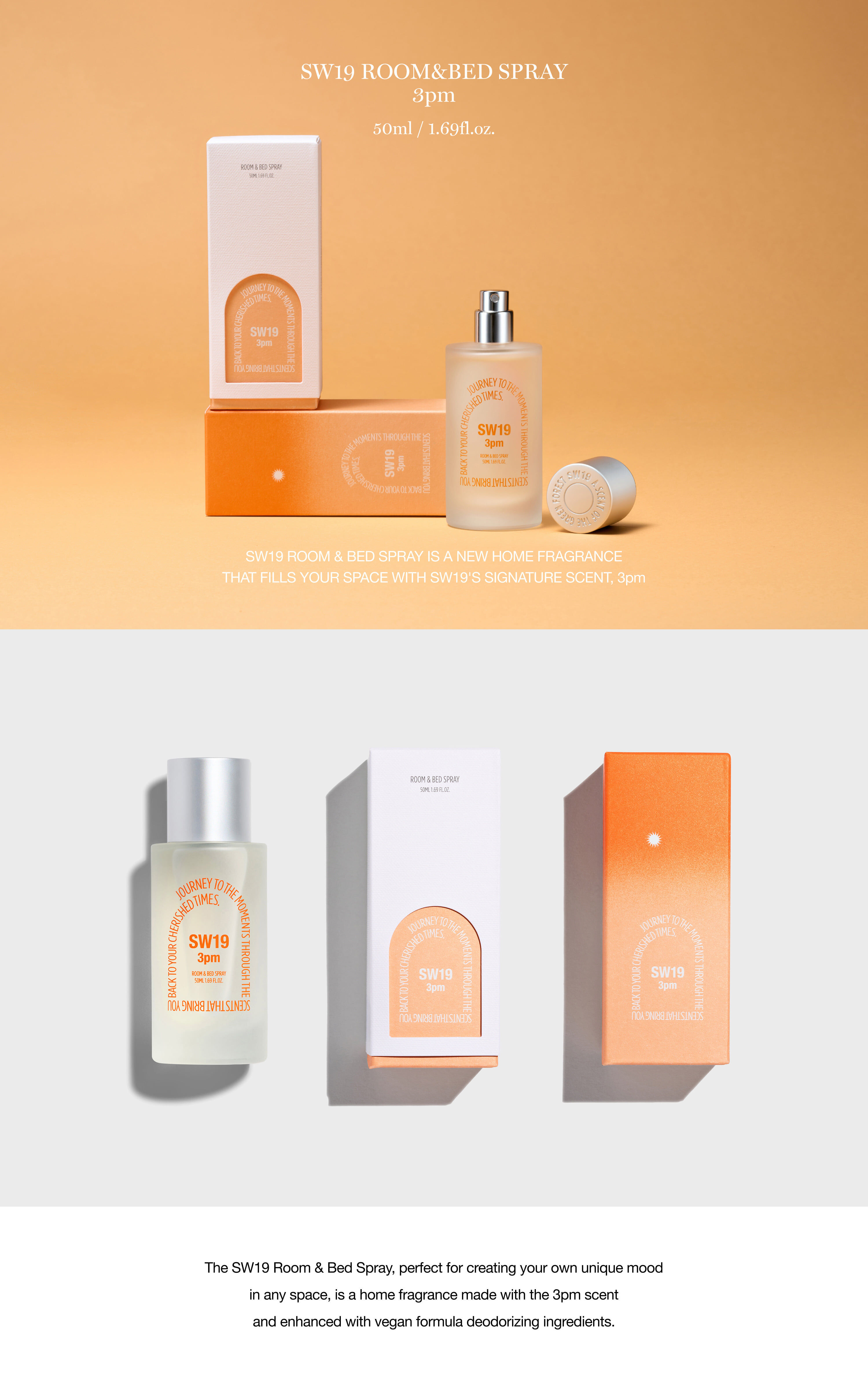 SW19 3pm 枕香&空間噴霧,融合午後陽光氛圍與植物來源的氣味抑制成分,讓空間散發清新與溫暖果香,帶來午後獨有的悠然氛圍。